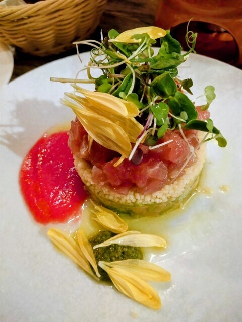 名物 アリゴからスタートして、カルパッチョ、チーズの盛り合わせや、自家製ピクルス、ホタテのウニソース焼き、鹿肉のロースト、他にも色々頼みすぎて満腹でした。