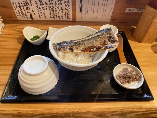 看板のさばめしは、脂の乗った鯖を香ばしく焼き上げてほぐし、ご飯の上にたっぷり。