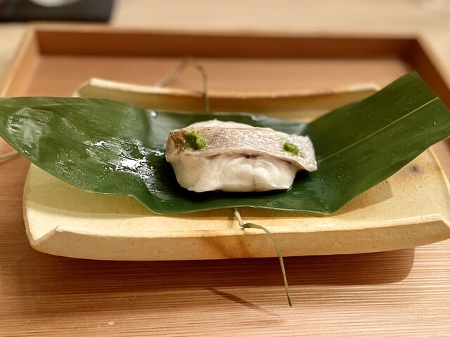 のどぐろの飯蒸し 桜餅のように桜の葉で巻いてあり、風味豊かでした。のどぐろの身も分厚かった!