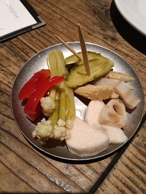 お通しのポテトチップスと生ビールでまずは酒が進み、白ワインを注文した後はピクルス・メロンとチーズの前菜で酔いはじめます。