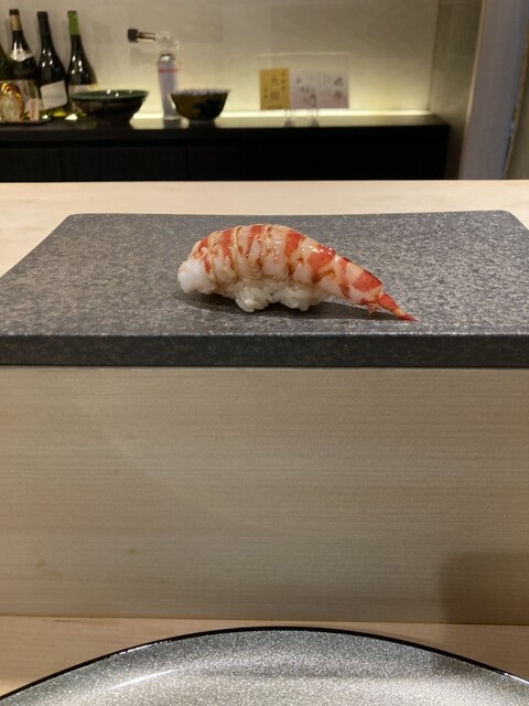 赤酢に変わりクルマ海老、シマアジ、金目鯛、ノドグロと続きます。特にシマアジが絶品でした。アジとはいうものの歯がない魚であるそうで釣ることが大変難しく漁獲量の少ない高級魚だそうです。