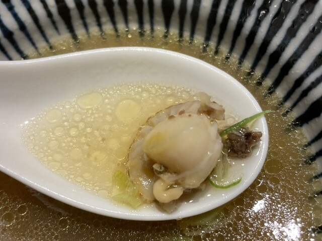 つけダレに潜らせた麺は貝の旨みでまろやかにコーティングされ、のど越しは更なる高みへ上昇中