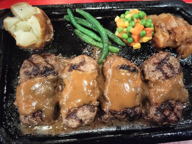 テーブルに豪快なハンバーグステーキが乗った皿が運ばれる。