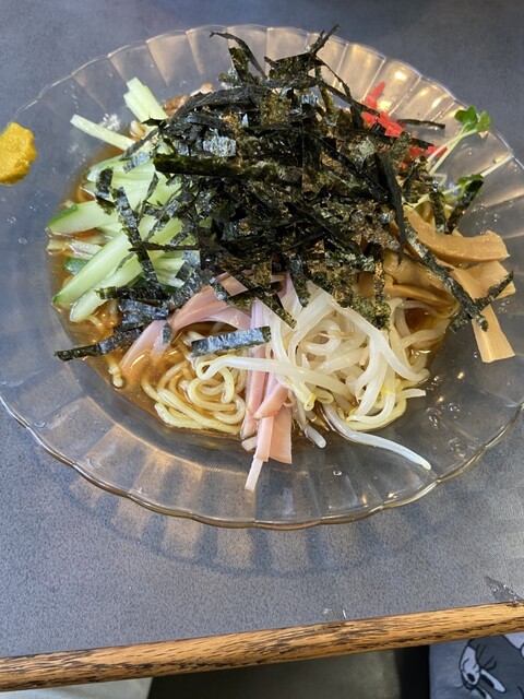 今回初めていただきました冷し中華ですが、細切り焼豚、ハム、胡瓜、もやし、紅生姜、海苔、メンマ、からしと具材がたっぷり。タレは甘めのコクのある中華ダレで絶品!本物の冷し中華です。