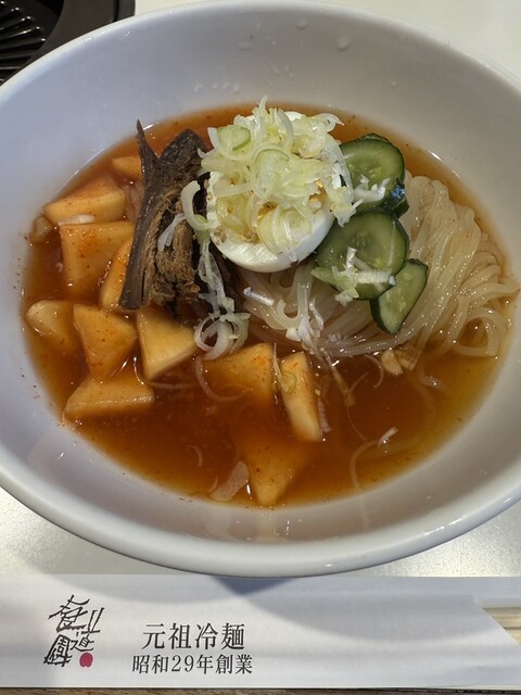 オーダーしてからわずか5分ほどで運ばれてきた冷麺は、まず見た目からして美しい。透き通るようなスープに浮かぶ艶やかな麺、その上に彩り良く盛られたカクテキやきゅうりの漬物が、食欲をそそる。ひと口すすって驚くのは、麺の強い“腰”。弾力がありながらもスッと歯切れが良く、独特の食感が心地よい。スープは程よい辛さで、旨みとキレが見事に調和し、飲むほどに体が温まるような深い味わいだ。