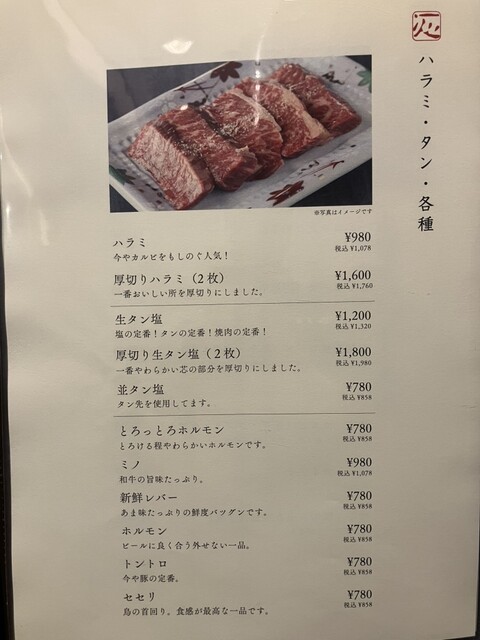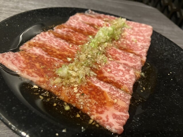 お店の3代看板メニュー?である、「一心ロース和牛(1,320円)」、「和牛厚切り上カルビ2枚(1,760円)」、「厚切り生タン塩2枚(1,980円)」は、味だけではなく、その日のお肉の状態によってカットの仕方も変えており、芸術的にカットされたお肉を提供するお皿も楽しめます。