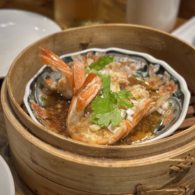 海老のガーリック蒸しは香ばしいソースが食欲をそそります。