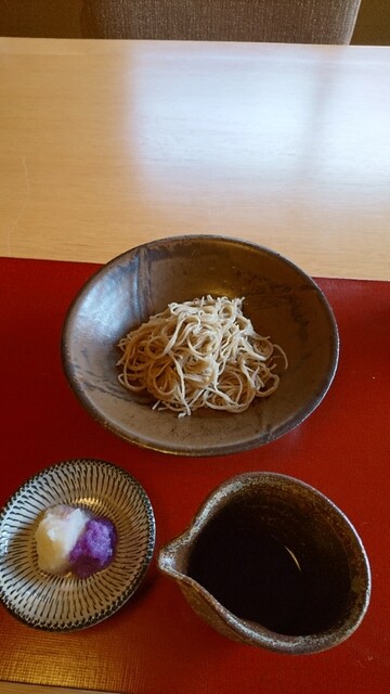 殻をむいた細めの蕎麦はつゆで、つゆは味のしっかりした甘味抑えたつゆ
