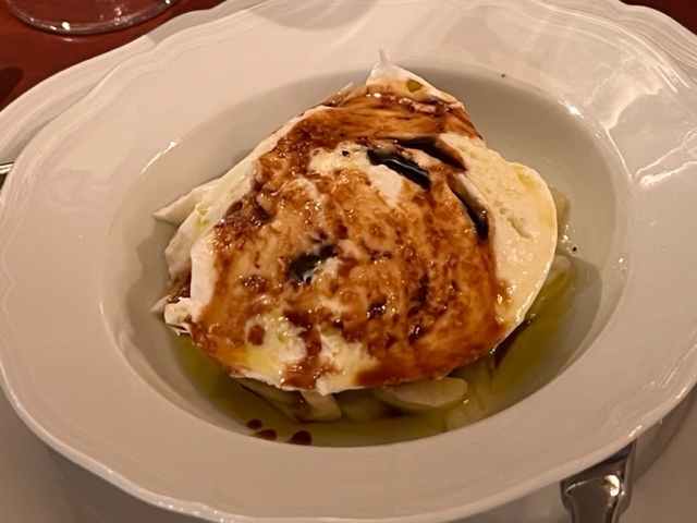 新玉ねぎ&サルシッチャにタレッジョチーズとブルーチーズを使ったホワイトソース(トリュフがけ)の料理が超美味しい