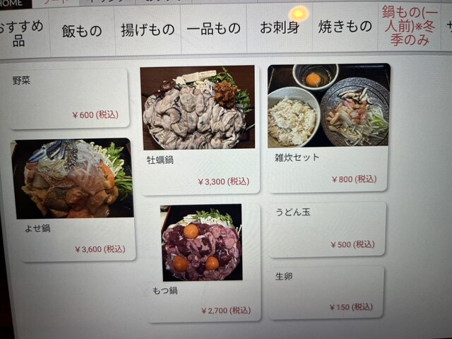 中落ち、ネギトロ定食、揚げ物盛り合わせ定食、焼き魚定食、オムレツ定食でした。