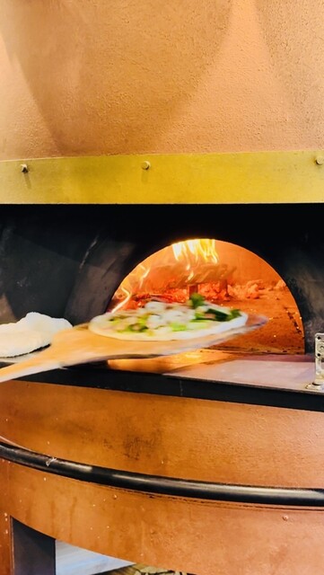 ピザ釜でおよそ1分ほどで焼き上がるピッツァは