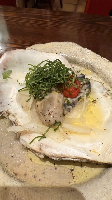 大粒の牡蠣が3個、山盛りの大葉、オニオン