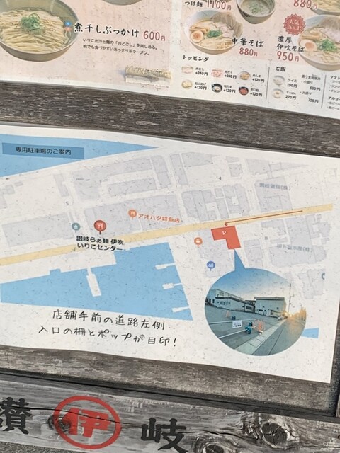 お店の前にメニュー表と駐車場の案内図があります。