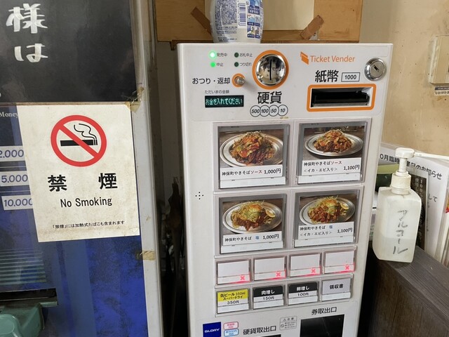 12時10分に着いたのですが、並びの先頭。カウンターのみ10席くらい。エビ、イカ入りソース焼きそばの食券を買って店員さんに渡した際に大盛り(無料)と告げ、待つ事5分くらいで着席。さらに待つ事10分くらいでアツアツのお皿に載った焼きそばが目の前に。