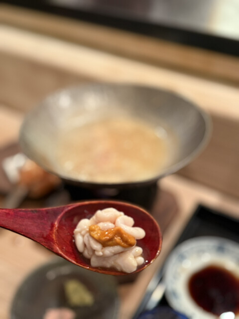そしてこちらは贅沢すぎる、活車海老、鮑、白子の高級食材をしゃぶしゃぶにし、仕上げに雲丹を添えて食べる一品。まさに絶品でした!