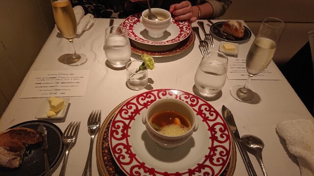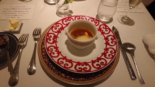 ムール具とグリーンピースのピュレ、スープ・ド・ポワソン