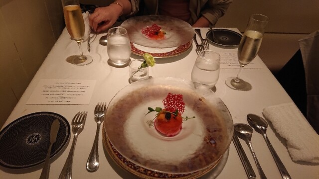 ノルウェーサーモンの低温調理、ビーツのムース、コンソメジュ