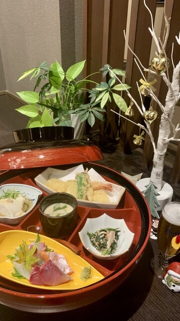 すずらん御膳は大きな器で提供されとても豪華✨ 天ぷらやお造り小鉢、茶碗蒸しなどが入ってます。 お造りは、サーモン、たい、マグロ