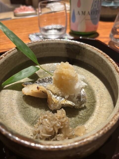 サクサクの稚鮎の唐揚げには広島の純米大吟醸。米の種類が千本錦で辛口しっかり濃厚でした♪