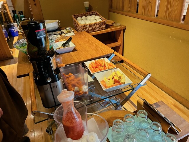 晩御飯は大満足。ついつい飲みすぎちゃったかなぁ。翌日の朝食は、8時30分以降のスタートなので、少しまったりです