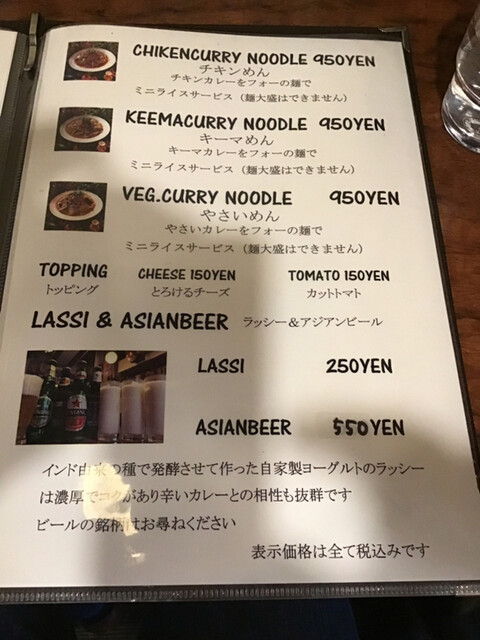席に着いてメニューを見る。2年振りなのでメニューに変化があるかもしれない。細部まで確認。おっと、以前はカレーのライス大盛りとカレー麺のミニライス追加が無料サービスだったが、プラス50円になっている。カレーやカレー麺自体の値段も50円値上げしたようだ。もともとクオリティに対して安すぎる設定だったのでまったく問題ない。