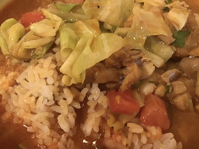 ご飯を混ぜると、残ったスープカレーが再度輝く。ヌードルの切れ端が少し混ざっているのもポイント。インド風そば飯。