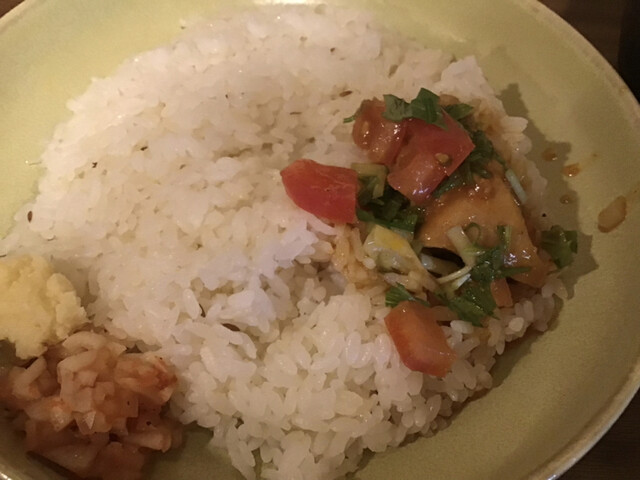 麺は5分で完食。チキンや野菜などの具材はまだ半分以上残してある。ここから第2ステージ。ミニライスを残ったスープカレーの中に全部投入。ライスはクミンで風味つけられ、タマネギのアチャールのみじん切りとおろし生姜が添えられる。細かいところまで手間をかけた逸品を50円で提供するのは利益のためではなく、お客様へのサービス精神と分かる。以前はこれを無料サービスにしていたのだから恐れ入る。