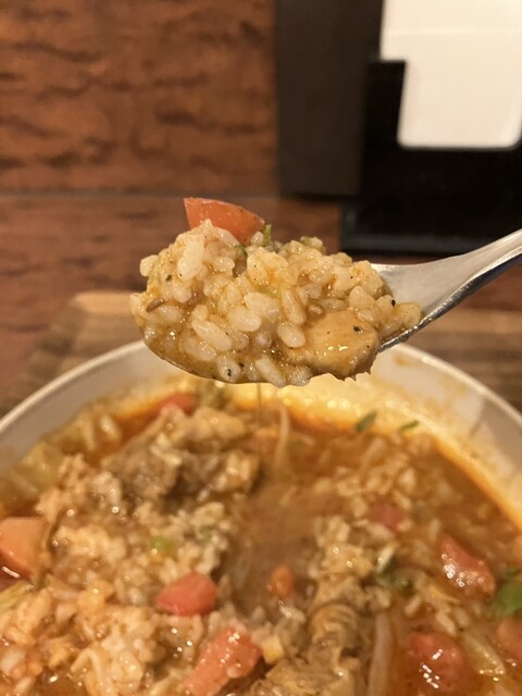ライスを軽く混ぜて再度食べ始める。恐ろしいほど旨い。この最高のスープカレーを食べるためにこのレビューに書いた【注意事項】をよく予習してお店に行ってほしい。
