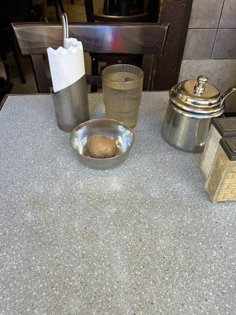 席に着くと店員さんがお水とジャガイモを持ってきてくれる。入り口の券売機で買った食券を渡すときに辛さを聞かれる。
