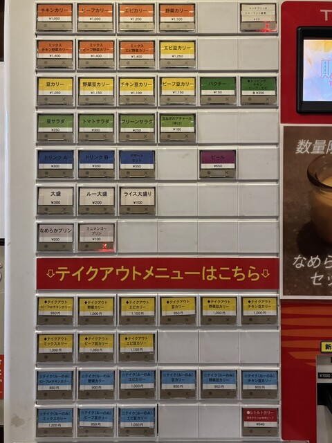 券売機の前に立っていつもの“チキン豆カリー”を発券しようとするが、何か前回と様子が違う。あれ?!チキン豆カリーの横に“ビーフ豆カリー”のボタンがある。