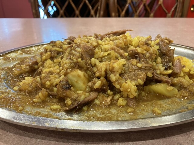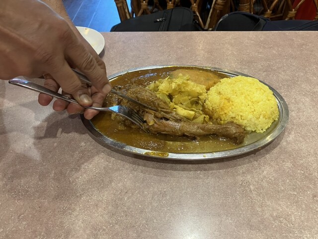 注文すると骨付きの鶏モモ肉がドーンと鎮座するお皿がすぐにテーブルに到着。店員さんが手際よく骨を外して食べやすくしてくれます。全体をよくかき混ぜて食べるようにアドバイスをされて、忠実に実行するといよいよ実食。