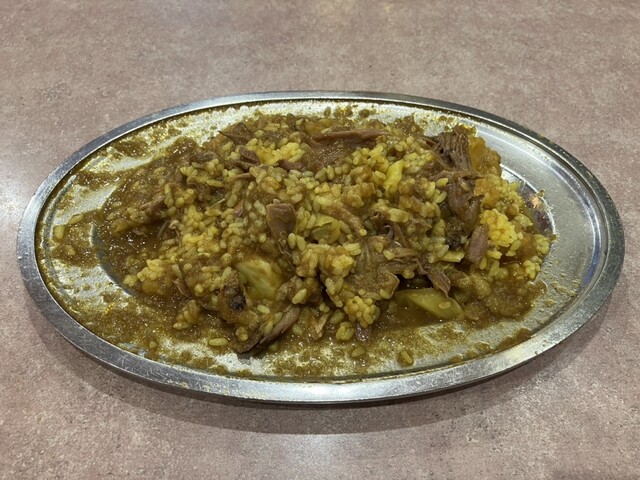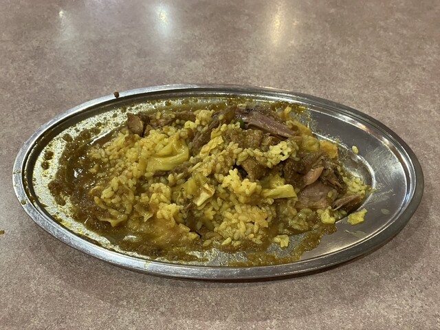 金属製の楕円型プレートにはターメリックライス、ムルギー(カレーとは違う)、キャベツのピクルス、マッシュポテトが溢れんばかりに盛り付けられる。下手に混ぜるとプレートからこぼれてしまいそうなので、慎重に混ぜ合わせる。ただし、ある程度食べる部分による味ムラがあった方が楽しいのでざっくり混ぜるくらいがちょうど良い。