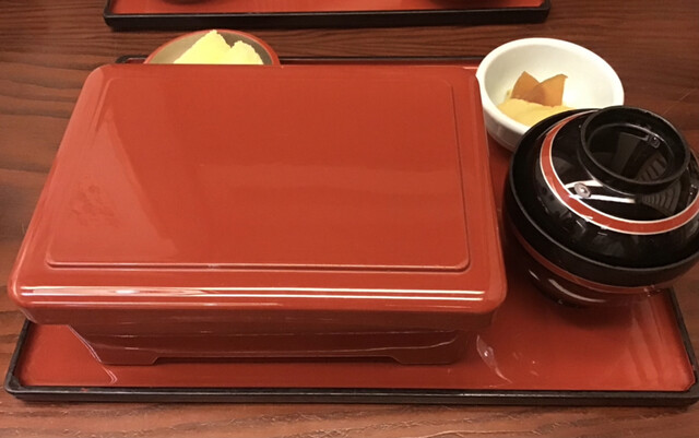 しばし待つとお重が運ばれる。蓋が被せてあるのは冷めるのを防ぐためだけではない。蓋を開けたときの感動の演出。