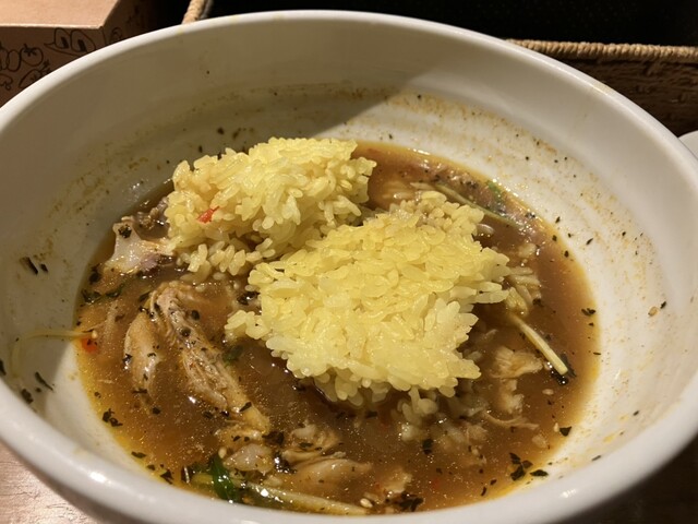 カレースープの器に残ったライスを全部投入。こうしてスープを余さず味わうのがスープカレーの正しい食べ方。