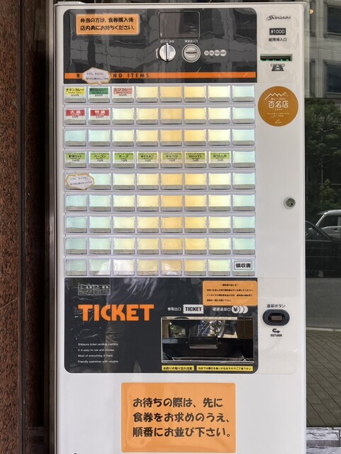千円札と10円玉を投入。まずはチキンカレーのボタンを押す。続いて野菜セットのボタンを押す。2枚の食券を持って店内に入る。