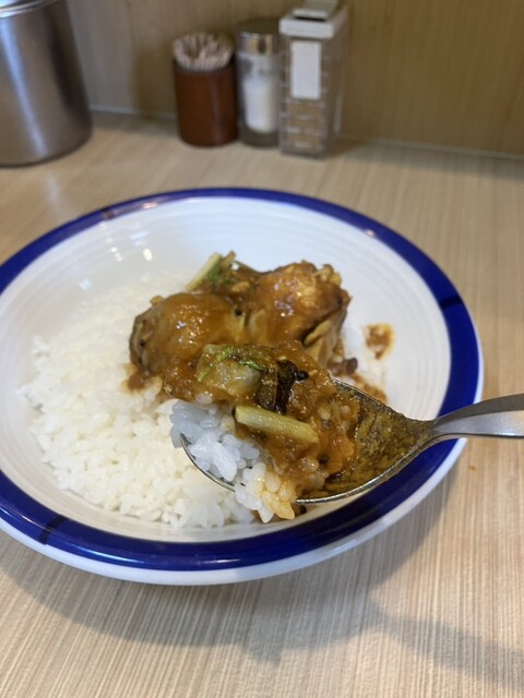 ちまちま食べている場合じゃない。カリーをすべてライスの皿にかける。ライス皿が溢れるギリギリのところですべてのカリーを受け止める。本店よりボリュームが多いような気がするが、気のせいだろうか。テンションが上がる。