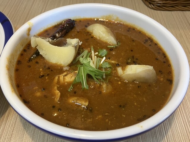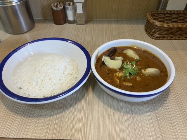 予め割っておいたジャガイモのカリーに投入して軽く混ぜる。具材少々とカリー少々をライスの上に載せる。サラサラのカリーがスッとライスに染み込んでいく様子を見るのが好き。具材の存在感が増す。