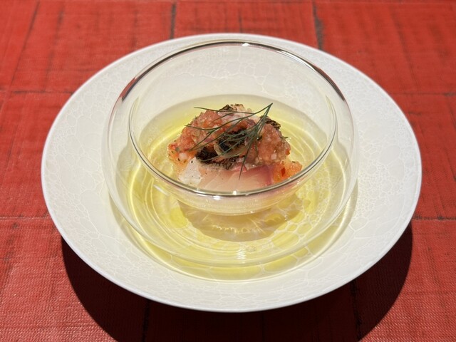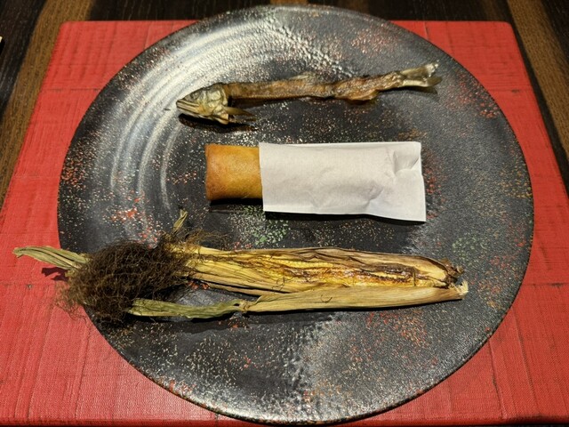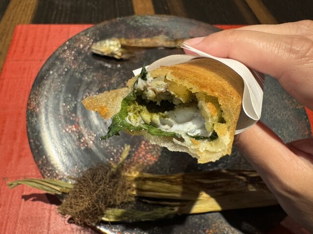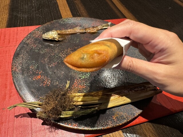 春巻きの餡には、鮎の身と大葉、アワビの肝ペーストが入り、熱々パリパリで美味しい!★