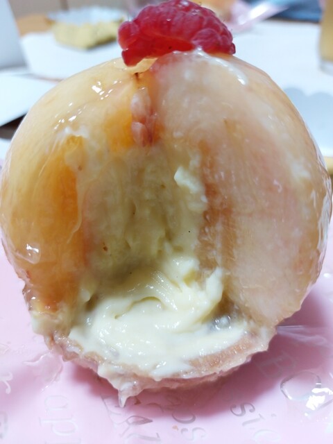 桃。もうモモだ。モモ以外の何ものでもない。完熟の果肉は当たり前に美味しいが、中に詰められたクリームがその甘さをさらに引き立てる。お互いに全く邪魔をしていない。素晴らしいバランスだ。