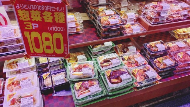 最寄り駅なので、よく利用するお惣菜屋さんです。どれも、お惣菜は美味しく手頃なお値段なので助かってます。特に、どれでも3パック=1080円はお安く助かってます。ついつい、貧乏性なので3パックを1食で食べるにはもったいないので…2〜3食に分けて食べてます(笑)。