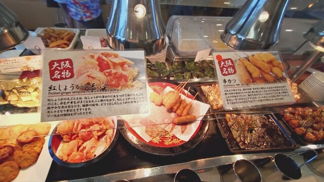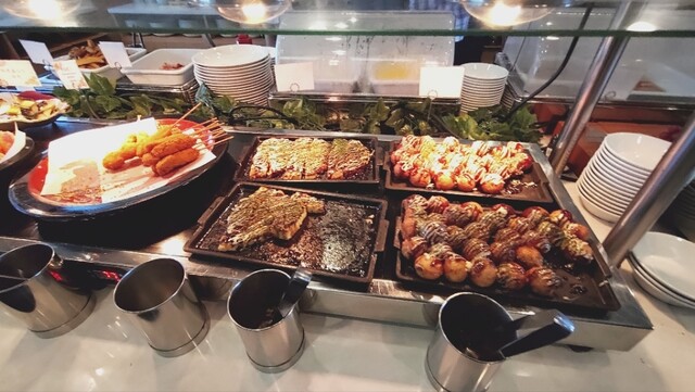 大阪を感じさせる…たこ焼き、串カツ、豚まん、ミックス・ジュースと最高でした。また、朝からミニ・海鮮丼や海鮮茶漬けも作れて大満足です。何よりも、ホテルの食堂は大阪城の目の前で最高の風景をシュチュエーションに朝食が食べれます。
