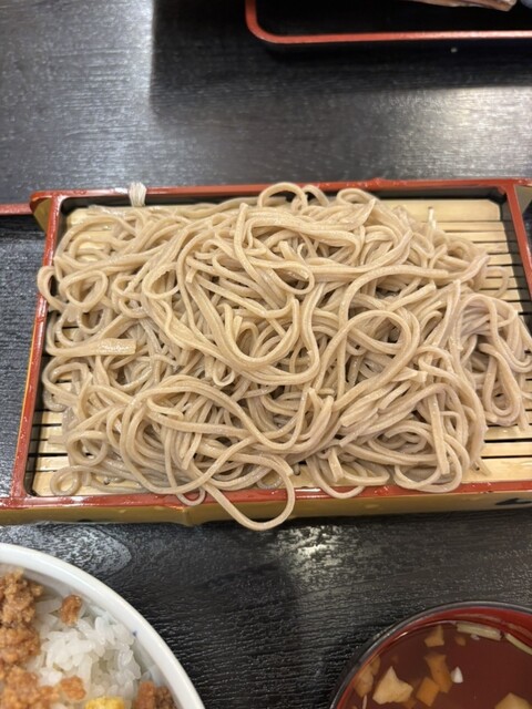 本来1300円の鶏そぼろ丼セット(もりそば、そぼろ丼、椀)が、そぼろを仕込みすぎたから1000円ということなので私はコチラを。