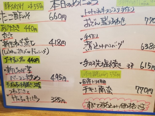 毎回行きますが、どれもこれも奥さんや大将の心がこもった料理で満足です❤️お値段もお手頃でちょこっとよって飲むのに最適‼️カウンターで他とお客さんとも仲良くなれて楽しいですよ家族ずれには個室もあり小さい子どもも来ていて楽しそうです。そろそろおでんの季節になります‼️これがまた美味しいのですよ