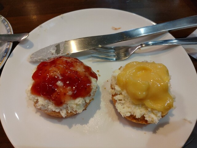 全粒粉スコーンは香ばしくてザクふわ。惜しみなく塗れるクロテッドクリームとジャムで、何個でもいけそう。特に「苺とスパイスのコンフィチュール」は風味豊かでクセになる美味しさ。気づけば最後は“妖怪ジャム舐め”状態に…(笑)
