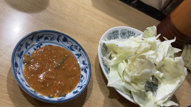 串焼き用の味噌ダレ(左)&お通しキャベツ(右)