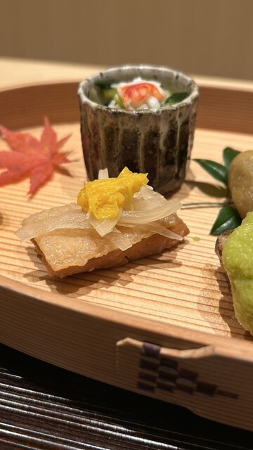 ・八寸(海老芋の唐揚げ、子持ち鮎のコンフィ、揚げ銀杏、蟹とほうれん草のおひたし、シャケの南蛮漬け、さつまいも、冬鴨燻製)