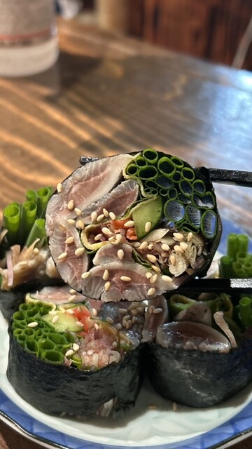 鮮度抜群で脂の乗った鰯を、たっぷりの薬味とともに海苔で巻いたいた一品。