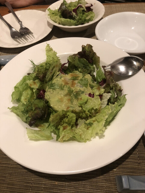 先ずは、サラダから。酸味の効いたドレッシングでさっぱりしておいしい。