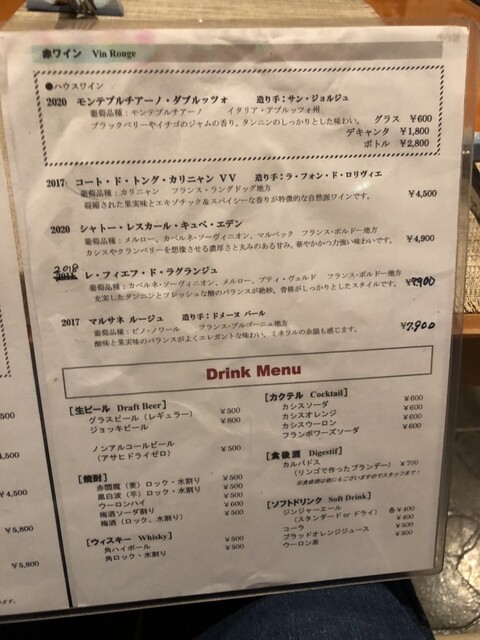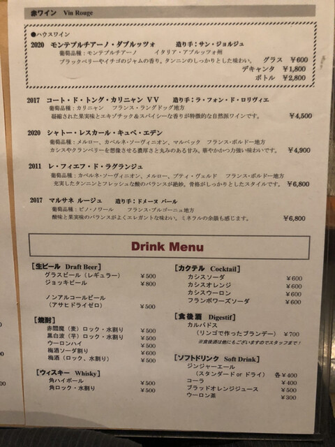 ・ハウスワイン赤:2020 モンテプルチアーノ・ダブルッツォ グラス¥600