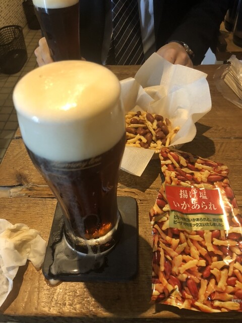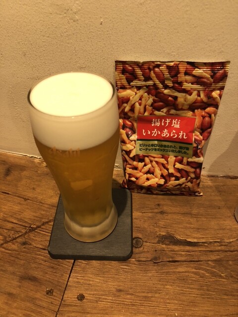 生ビール:ハーフ&ハーフ、カルビーかっぱえびせん、なとり ひとつぶマイルドチーズ